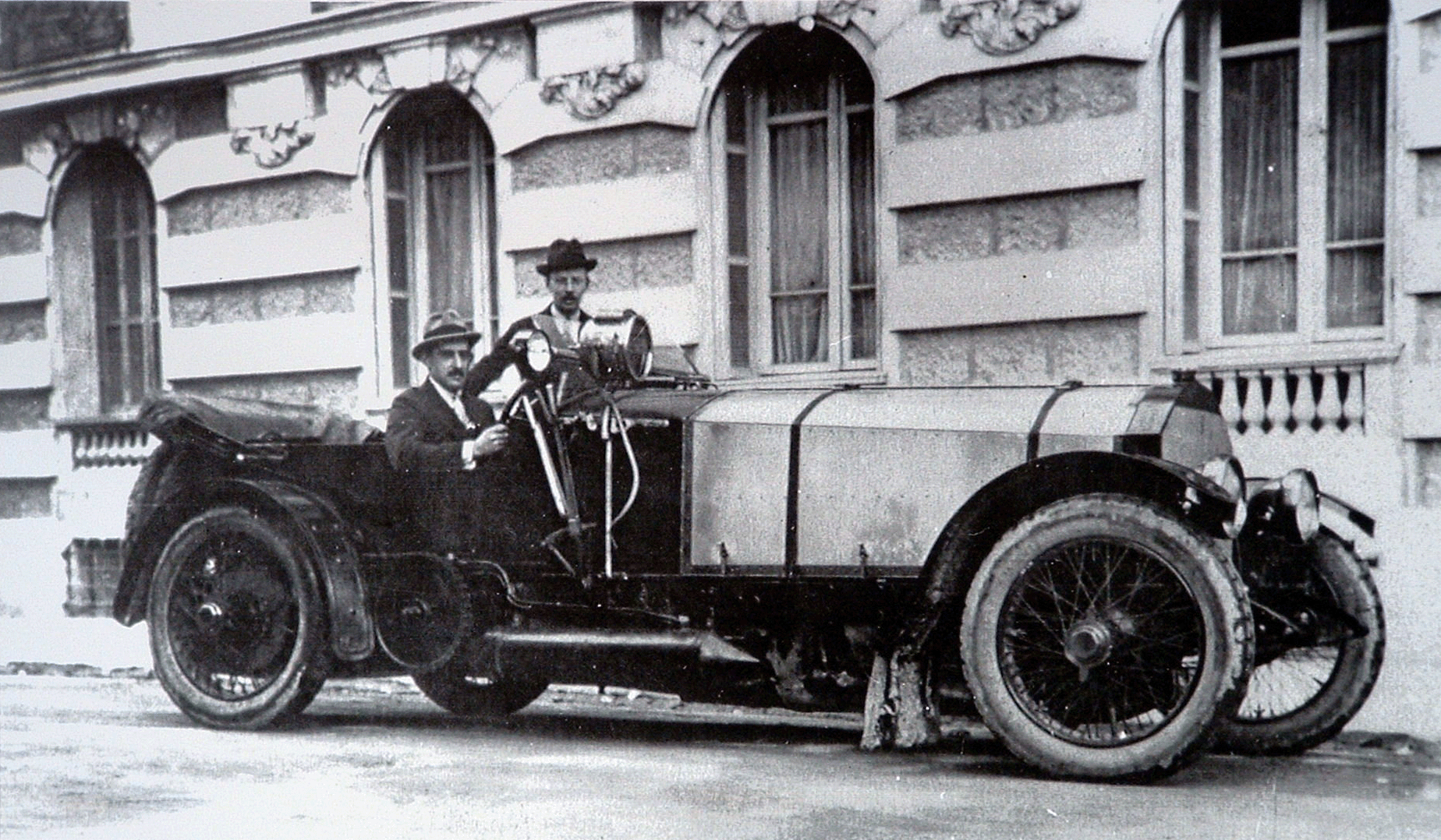 Photo: Louis Zborowski and Clive Gallop with Chitty Bang Bang 2 in Nice, 1922, outside the Negresco Hotel